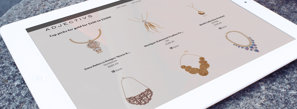 Adjectivs is an online shopping site that helps people find necklaces similar to how Kayak helps you find airline tickets. Once you describe the type of necklace you’re looking for, the website searches through a product database from hundreds of online retailers and displays matching items based on your specific criteria.