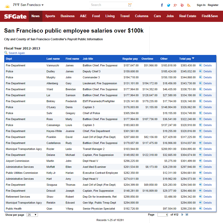 - Public Employee Salary Database: Always an interesting topic for the general public, public employee salary database is a top performer for many of our media customers. Reporters can obtain such data from government agencies and turn it into a searchable database to generate continuous traffic. For example, the salary database published by the San Francisco Chronicle generated over 1 million page views on the first day it was launched and continues to drive traffic to the site throughout the year.