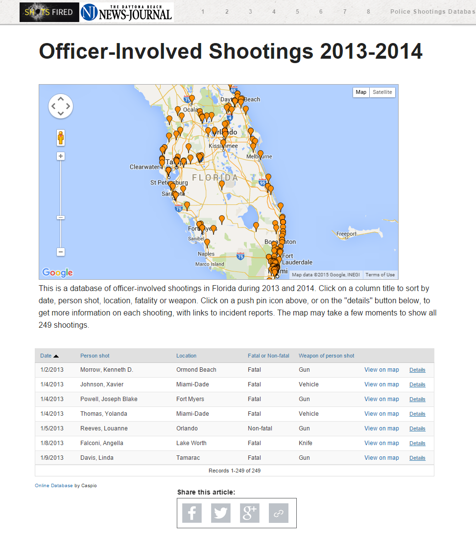 Citizens care about the welfare of their community and location-based data serves them in ways that a generalized news site can’t. With capabilities such as Google Maps integration and distance search, Caspio makes it easy to build location-based applications that encourage readers to drill down into their particular city and neighborhood. For example, just last week the Daytona Beach News-Journal used Caspio to create an interactive map of all officer-involved shootings in Florida, exposing new data that was previously unavailable to the public.