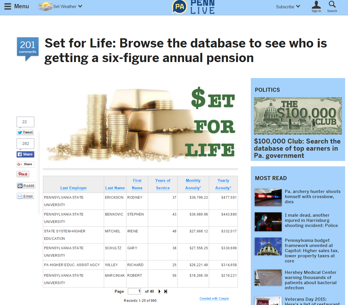 Incorporating interesting or previously-unknown data into a public interest story encourages reader engagement and social sharing. For example, when PennLive.com posted a database of state employee pensions (some of which reached as high as $400K per year), there was an immediate traffic spike from the heated discussions across hundreds of social media shares and comments.