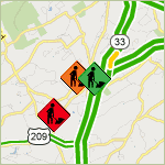 The Poconos Traffic Center displays traffic information from a variety of sources. Roadwork information that comes from Pennsylvania Department of Transportation is displayed with diamond shaped roadwork icons, and traffic incidents from the 511PA highway information network are marked with triangular road sign icons.