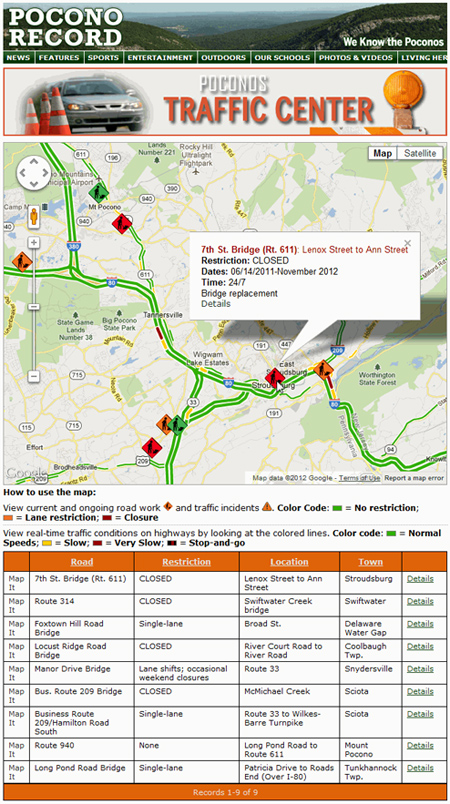 As the newspaper for Monroe County, Pennsylvania, the Pocono Record (part of the Dow Jones Local Media Group) is committed to delivering up-to-date community news. Much of the population commutes to New York City or New Jersey, so traffic information is a vital part of the paper’s online edition. Residents use the Poconos Traffic Center to check traffic flow, locate roadwork congestion, and link to further information about each traffic incident.