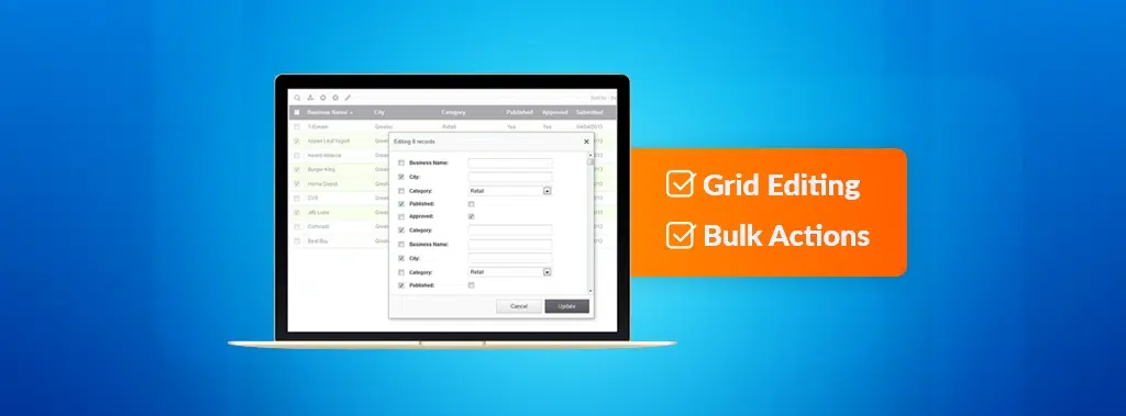 - Bulk Edit – In addition to grid-edit, you will also be able to update fields for multiple records using a bulk-edit operation. First, select the records you want to update and click on the bulk-edit icon. This will pop up an interface to update any fields that are configured for bulk editing.