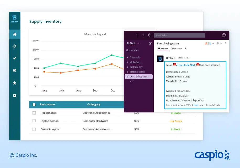In an inventory management app, when inventory levels for products fall below a certain threshold in your Caspio database, you can configure the extension to send an automated Slack message to the procurement team with the product details and recommended reorder quantities. This process eliminates the need for manual checks, helps ensure popular items remain in stock and prevents sales disruptions caused by shortages.