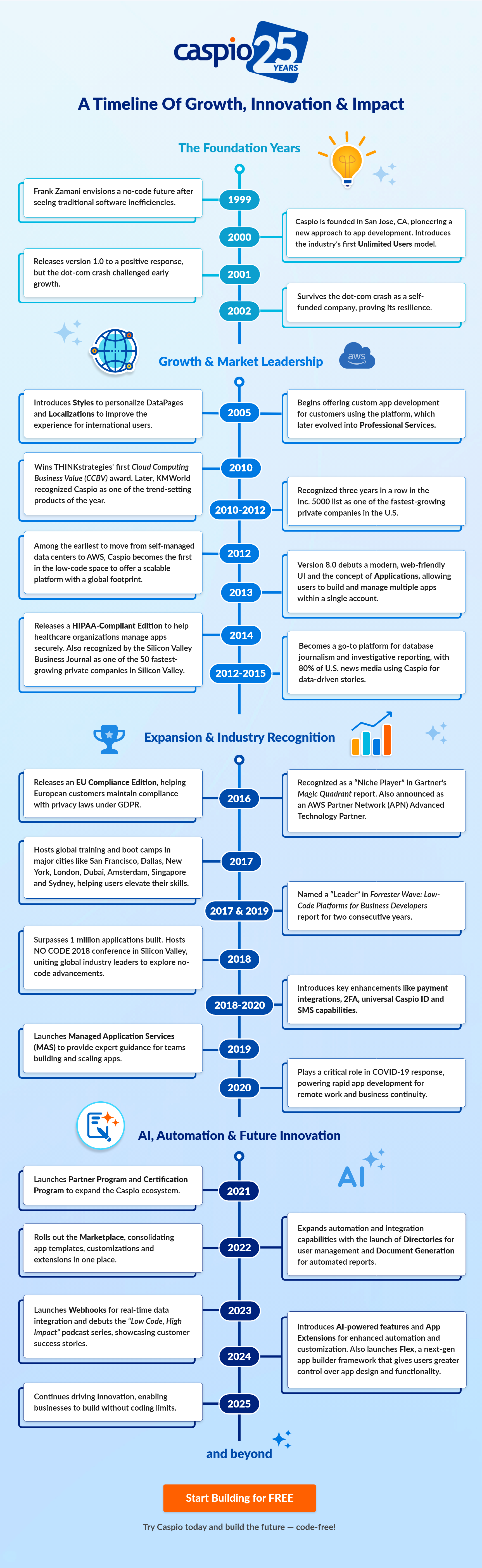 From its early days as a bold, fresh idea to becoming a trusted platform that powers businesses worldwide, Caspio has continually evolved to meet the changing needs of organizations, redefining how applications are built and deployed.