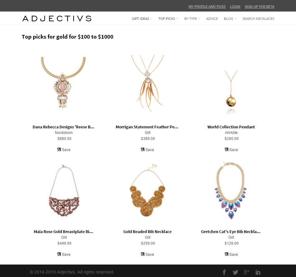 Adjectivs is an online shopping site that helps people find necklaces similar to how Kayak helps you find airline tickets. Once you describe the type of necklace you’re looking for, the website searches through a product database from hundreds of online retailers and displays matching items based on your specific criteria.