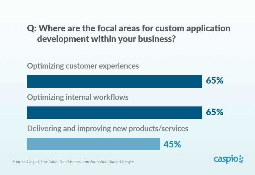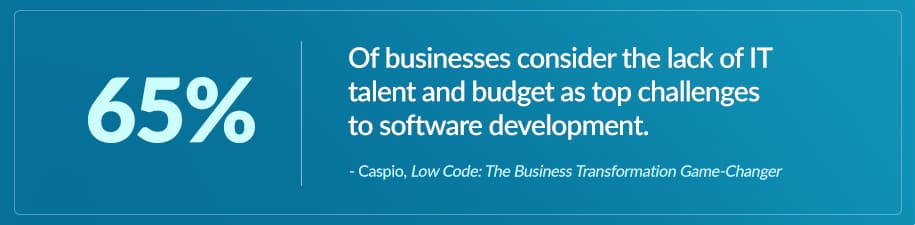 The provision of tools for increased digital capability and proper data management, in particular, falls within the scope of IT. Unfortunately, 65% of businesses report the lack of IT talent and budget as top challenges when it comes to building and supporting custom business applications.