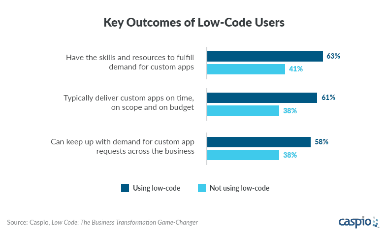 Our research shows that businesses using low-code have greater success in keeping up with the demand for application requests across the business. They typically deliver custom apps on time, scope and budget.