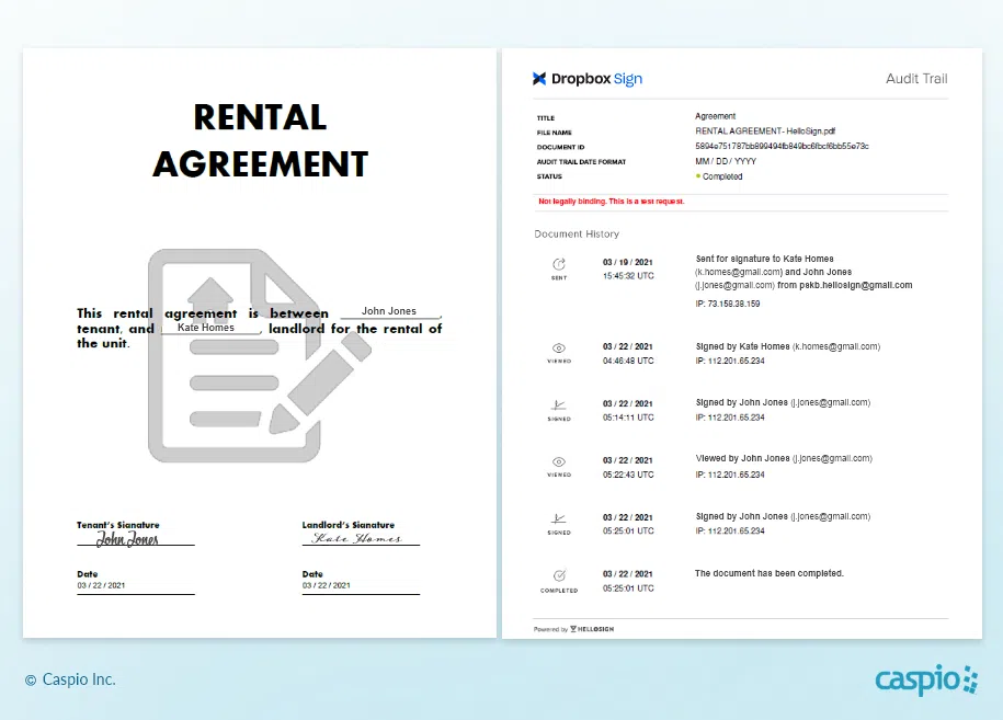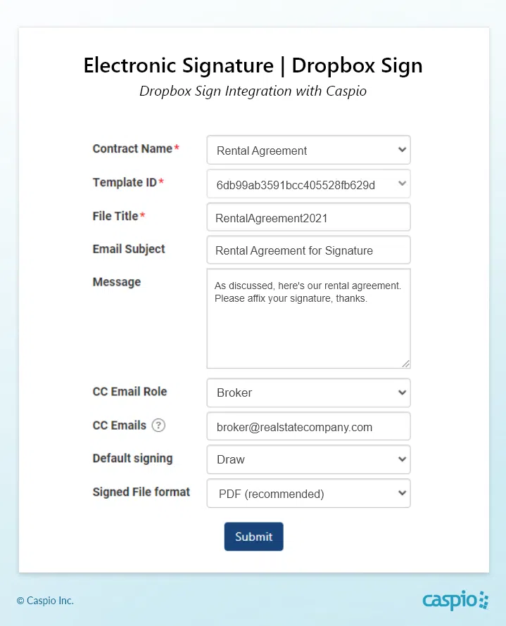 In many countries around the world, electronic signatures already hold the same legally binding qualities as standard signatures. This opens opportunities to streamline how law firms handle licensing agreements, policy terms and countless other legal documents. Intake pertinent client details and requirements like IDs from a Caspio web form, which then populates the fields in your Dropbox Sign template for instant sending and signing.