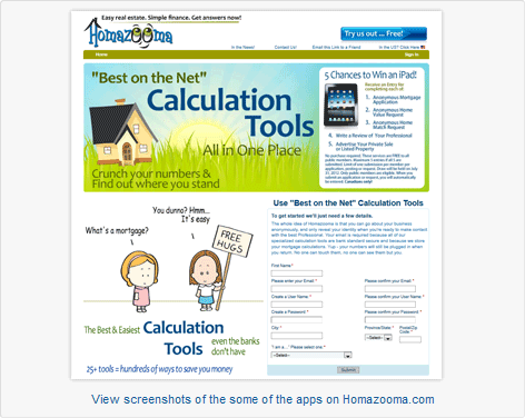 Unlike other services, Homazooma keeps home buyers anonymous, which puts them in control of the process. The apps are primarily for real estate and financial analysis and include many web forms, some quite lengthy and complex, and reports with extensive number crunching. One of the applications, a “Home Affordability Analysis” calculator, takes 13 factors into consideration for performing multiple calculations that give users a comprehensive picture of the type of home they can afford.
