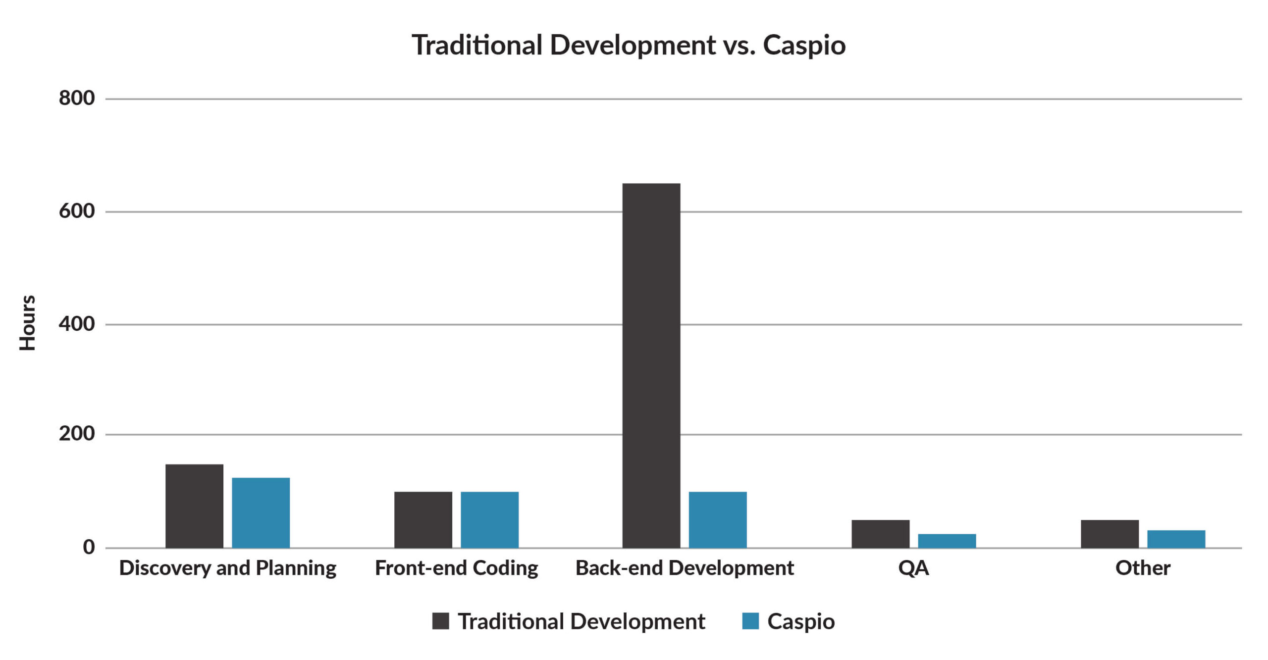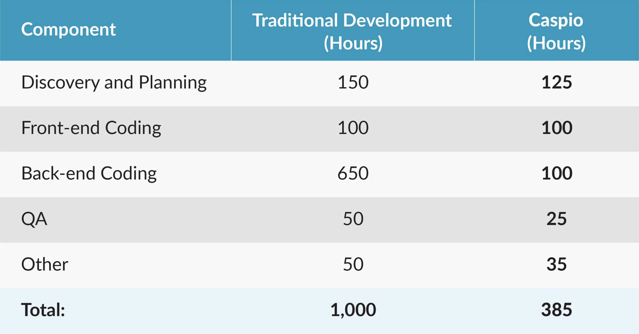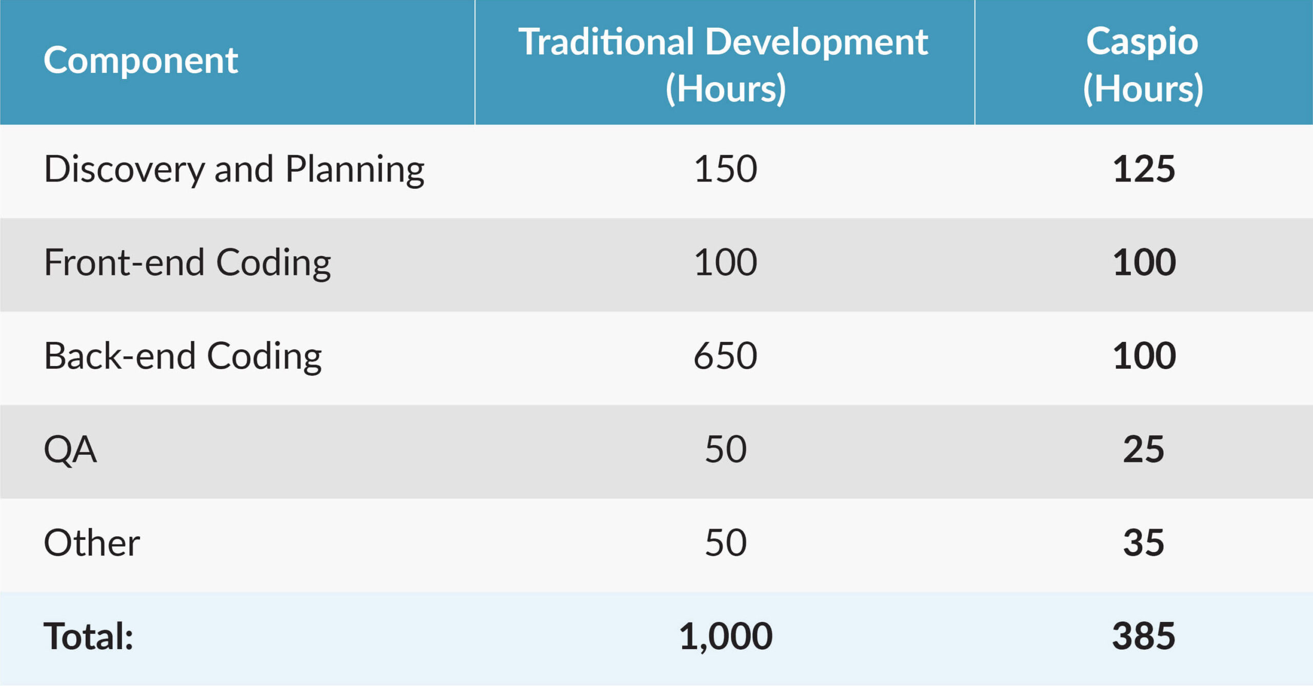 As we see from our imaginary example, our project uses just 38.5% the number of hours if developed on Caspio rather than using traditional development. This means that Caspio reduces our overall development time by over 60%.