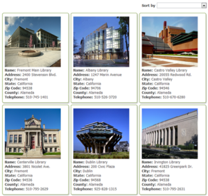 Choose the grid layout to display picture-based reports such as housing listings or, in this case, library listings to customers or public users. Information for each result is contained in a box where there is enough space for a large image. Fields are labeled as needed.