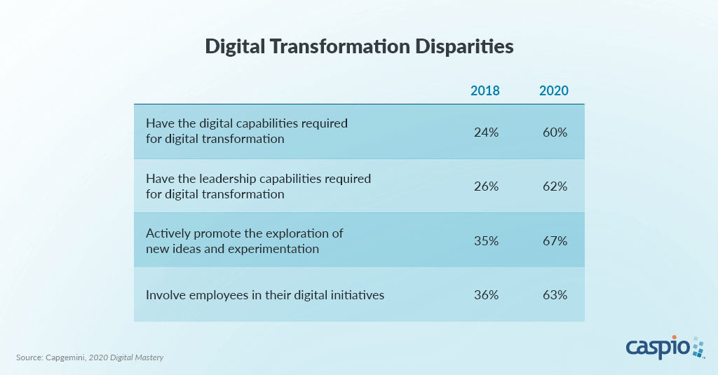 Before COVID-19, only 24% of organizations said they had the capabilities to digitally transform. But as companies faced greater urgency due to the pandemic, that number skyrocketed to 60%.
