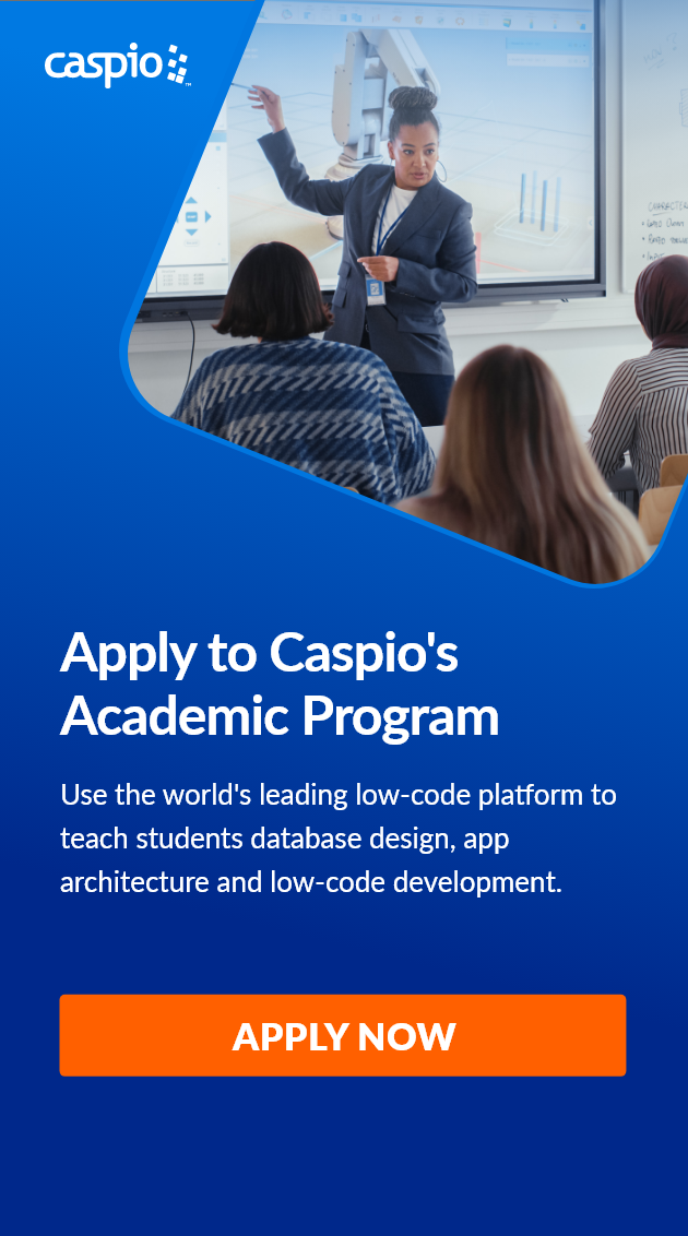 If you’re ready to uplevel database education in your classes, apply to Caspio’s Academic Program and learn how you can bring Caspio into the classroom to prepare the next generation of tech-savvy professionals.