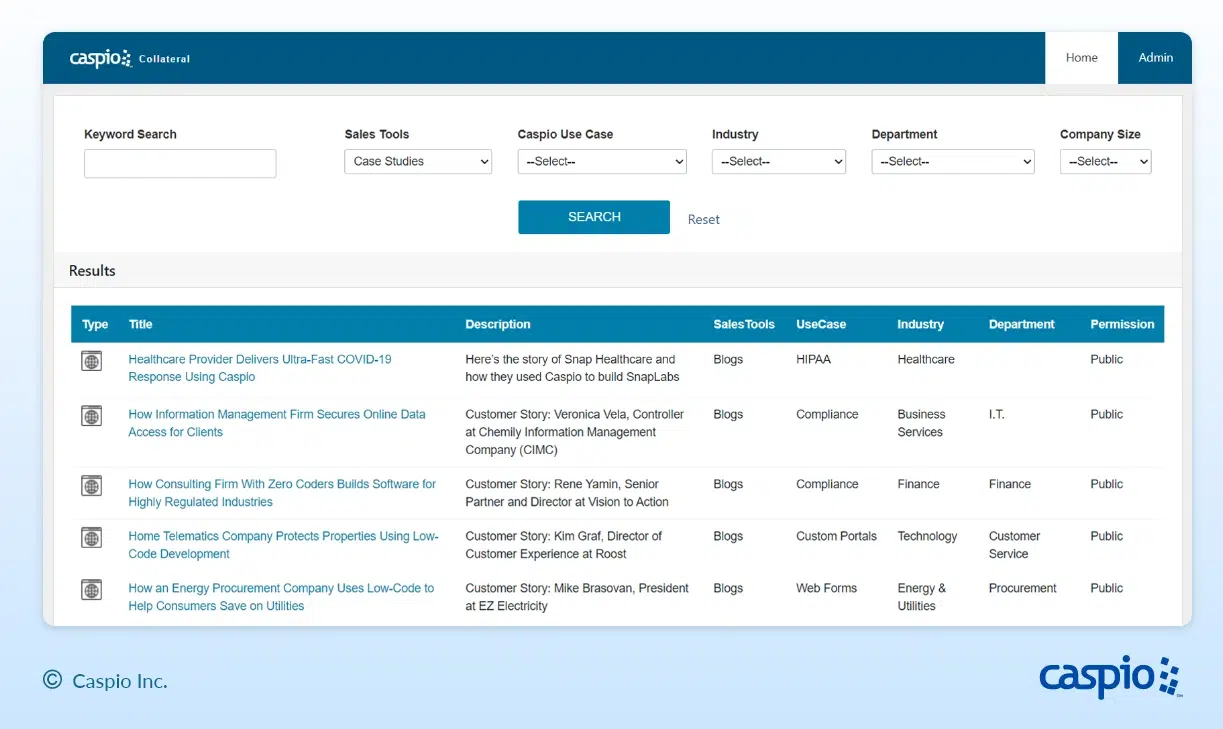 Here at Caspio, we built a centralized repository for all Sales and Marketing collateral. It features multiple search filters, admin and employee interfaces, an asset submission form and ways to gather feedback. You could create something similar for your business as well!