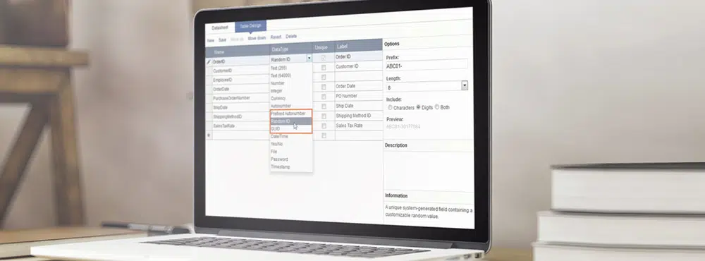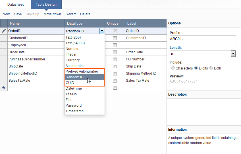 Prefixed Autonumber and Random ID are customizable for different length, character and digit combinations based on your preferences. You can apply these data types to new fields, or convert existing fields to them.
