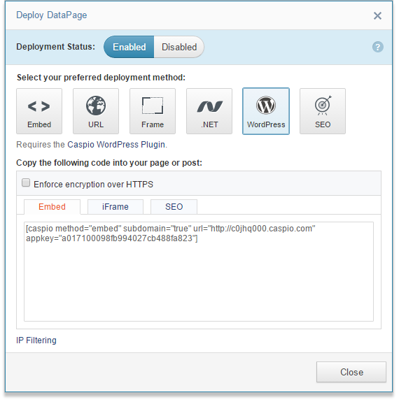 In this release, we have added a new WordPress option to the “Deploy” dialog. This option provides a shortcode that can be embedded in WordPress posts or pages, wherever you want the DataPage to appear. To utilize this deployment method, you need to download Caspio’s WordPress Plugin from the WordPress Plugin Directory.