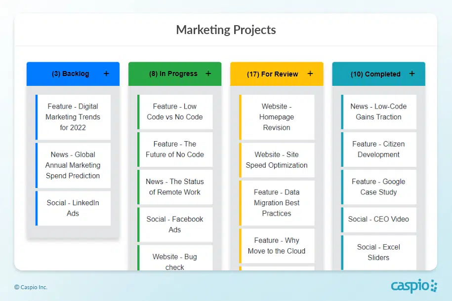 VISUALIZE WORK: Caspio’s Kanban board extension provides a seamless drag-and-drop interface for moving projects and tasks from backlog to completion.