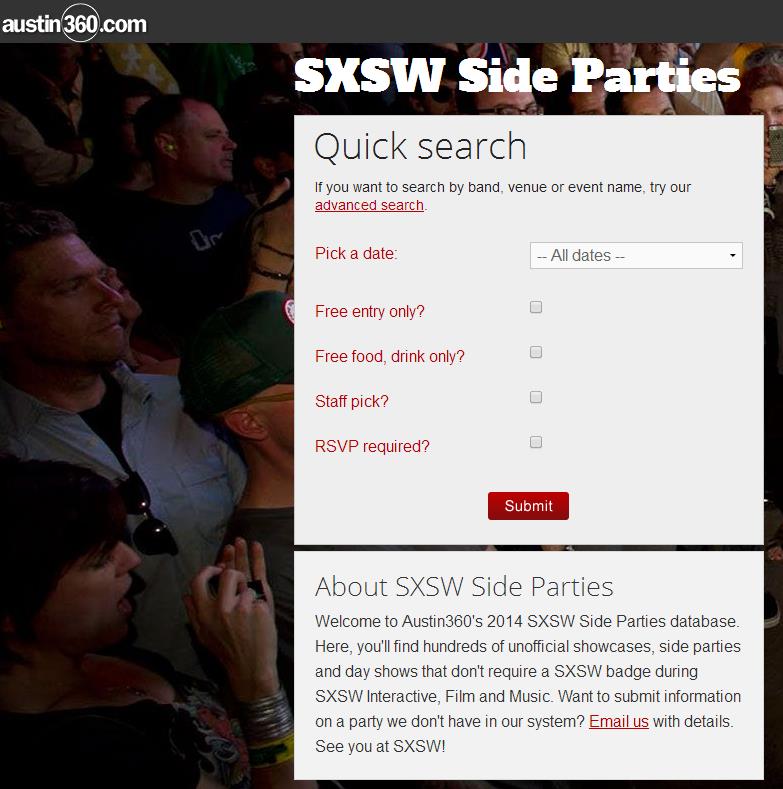 You can search for hundreds of unofficial event-related parties and shows that don’t require a SXSW badge, as well as submit new parties via your phone, tablet or laptop. The Austin-American Statesman has published the SXSW party finder app for several years now, and each year they add new enhancements and features to make it more user-friendly.