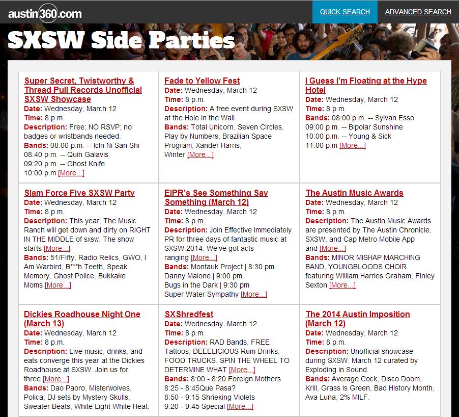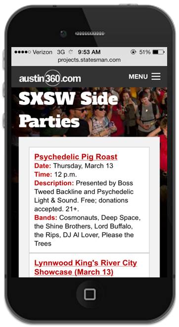 Not only does Caspio send several of our own staff to SXSW, one of our media customers has done some creative app development on the Caspio platform, and the result is the Austin-American Statesman’s SXSW Side Parties app that utilizes responsive design and SEO-friendly deployment.
