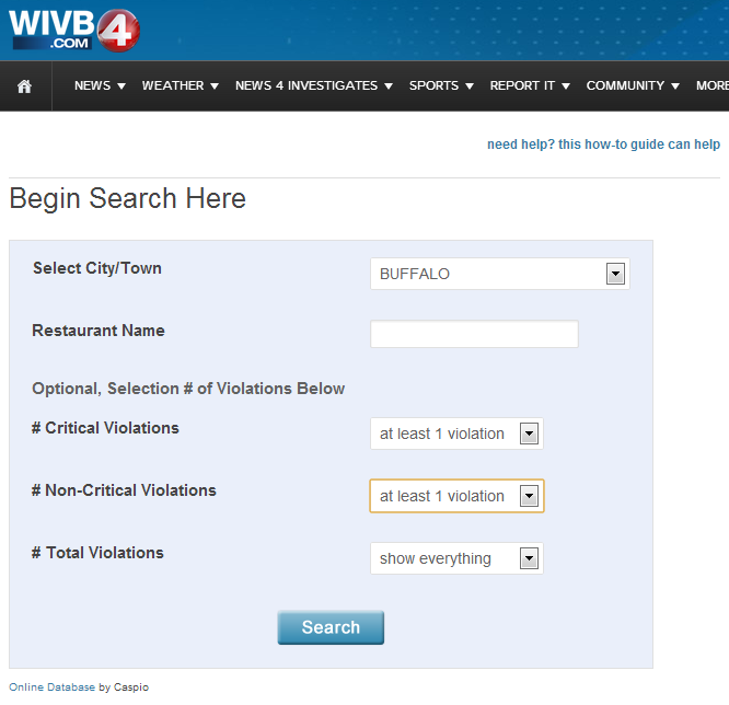 Now with the database up and running on the WIVB website, the public can search the health inspection data by county, city/town, restaurant name, or number of violations. Below is the user interface for Erie County.